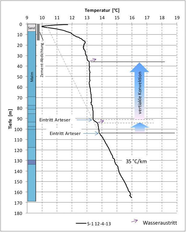Temperaturlog in Erdwärmesonde mit artesischem Grundwasser
